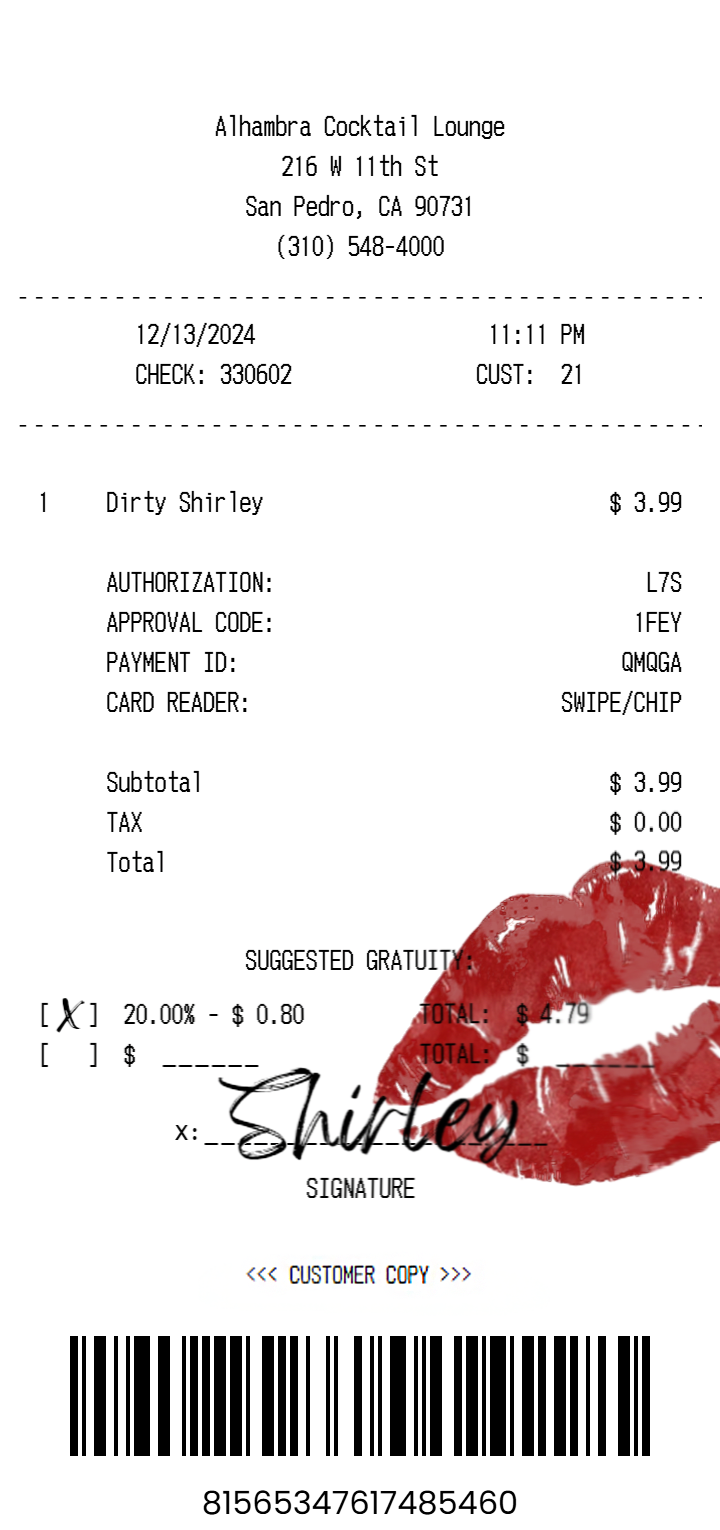 Does anyone actually take the Customer’s Copy? Dirty Shirley will be leaving thousands of receipts at local bars across the country. Signed for and kissed by Shirley, of course.